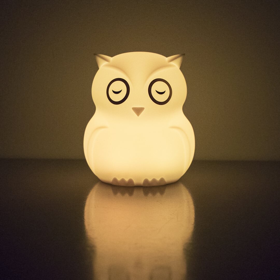 Denne natlampe i form af en ugle er fremstillet i blødt silikone, helt fri for BPA og phthalater. Den byder på ni forskellige LED-farver, som du nemt styrer med touch-funktion. Lampen har en automatisk slukketimer på 3 timer, og du kan også betjene den via den medfølgende fjernbetjening. Batteriet kan genoplades, så du slipper for at skifte batterier.