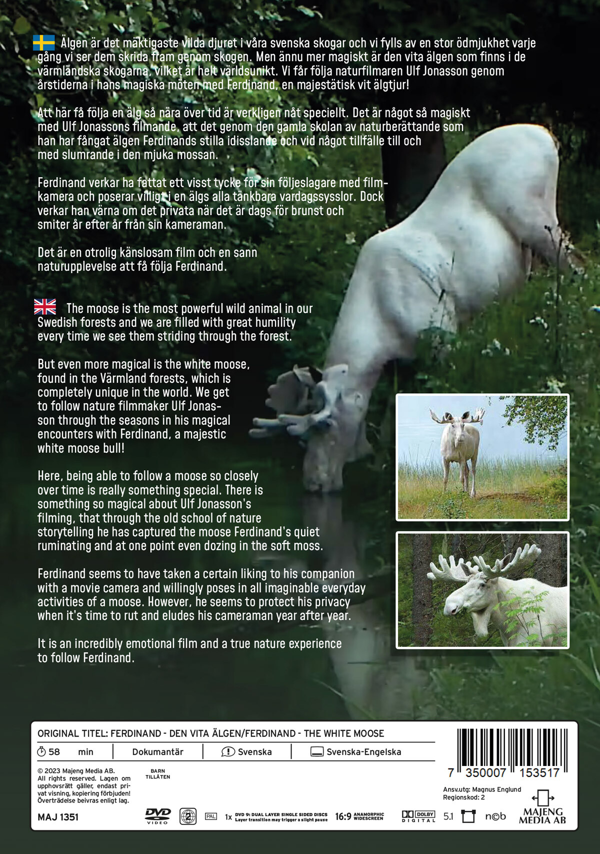 Elgen er det kraftigste vilde dyr i de svenske skove, og vi fyldes med stor ydmyghed, hver gang vi ser dem skride gennem skoven. Men endnu mere magisk er den hvide elg, der findes i de värmländska skove, som er unik fra hele verden. Vi kommer til at følge naturfilmskaberen Ulf Jonasson gennem årstiderne i hans magiske møder med Ferdinand, en majestætisk hvid elgtyr!