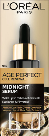 L'Oréal Paris Age Perfect Midnight Serum er et glødgivende natserum, der kombinerer to kraftfulde antioxidanter – neohesperidin og E-vitamin – for at beskytte hudcellerne mod frie radikaler og styrke hudens genopbygning i løbet af natten, hvor den er mest modtagelig for pleje.
