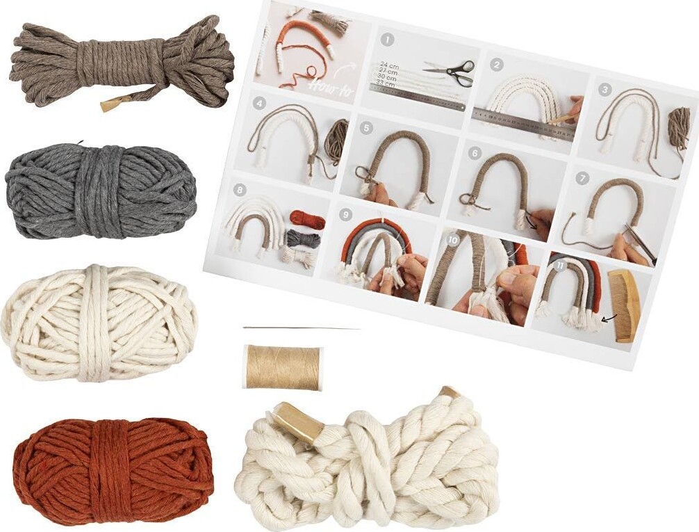 Med dette kit kan du lave en regnbue af macramé. Indeholder alle de materialer du skal bruge, og alt den vejledning du behøver.