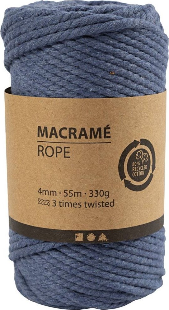 Macramé-garn i 3-tvundet/tvistet kvalitet i 80% genanvendt bomuld og 20% polyester. Denne kraftigere macramé-snor er oplagt til knytning af større projekter som vægophæng, blomsterampler, indkøbsnet og lign.
