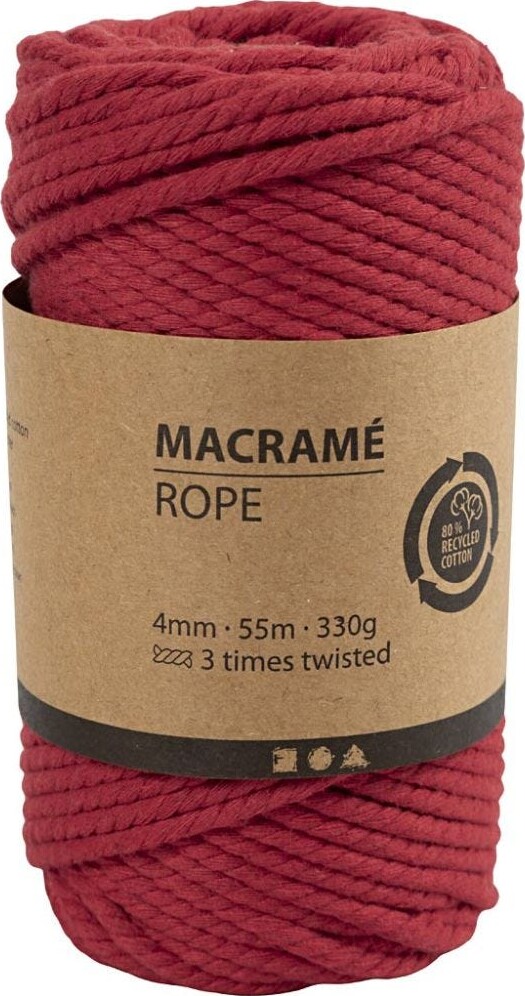 Macramé-garn i 3-tvundet/tvistet kvalitet i 80% genanvendt bomuld og 20% polyester. Denne kraftigere macramé-snor er oplagt til knytning af større projekter som vægophæng, blomsterampler, indkøbsnet og lign.