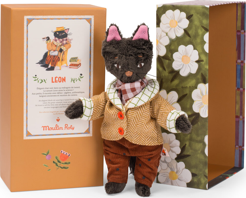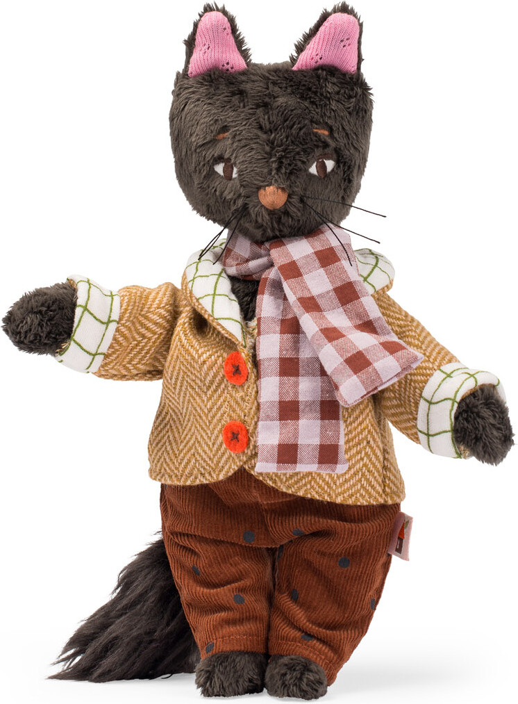 Katten Léon er et charmerende tøjdyr i stilfuldt vintertøj.