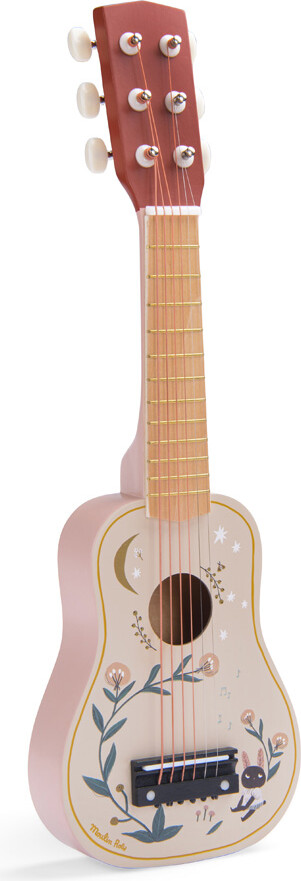 Guitar af træ dekoreret med fine illustrationer fra Après la pluie serien. Guitaren er forsynet med 6 metalstrenge, ligesom de professionelle! Udvikler rytme, motorik og musikalsk bevidsthed hos mindre børn.