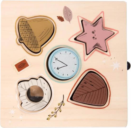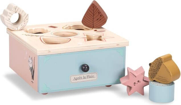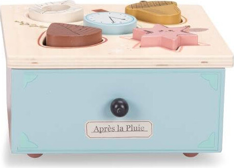 Smukt illustreret puttekasse i træ, som hjælper de mindste med at lære om former og farver.