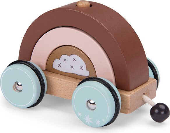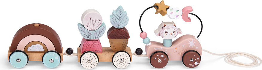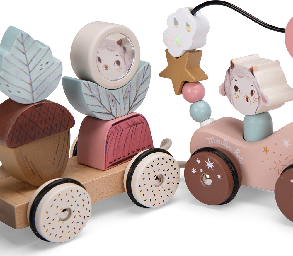 Dette skønne aktivitetstog i træ har 1 frontvogn med chauffør og 2 aftagelige vogne med stableklodser i regnbue- og naturtema. Specifikationer.