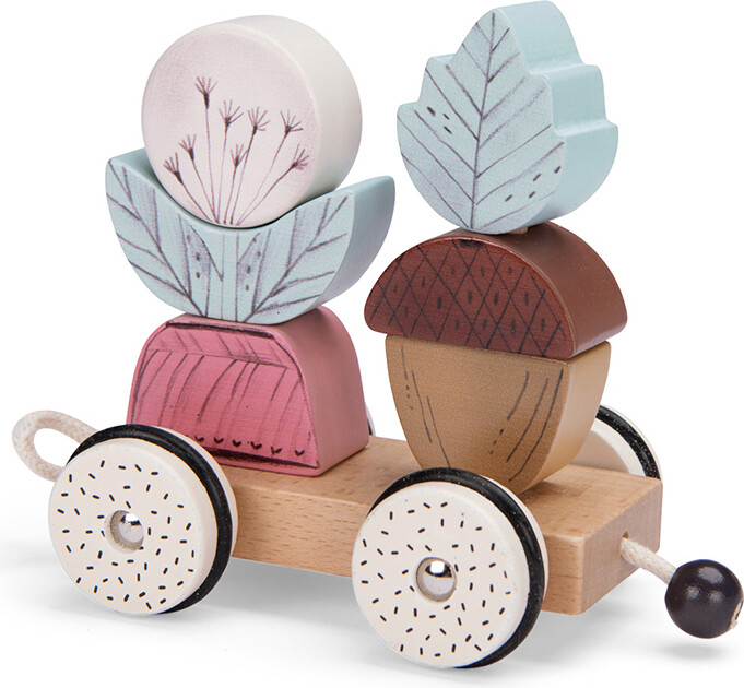 Et 2-i-1 legetøj, der kan trækkes med, bruges som tog/biler eller som stablelegetøj.