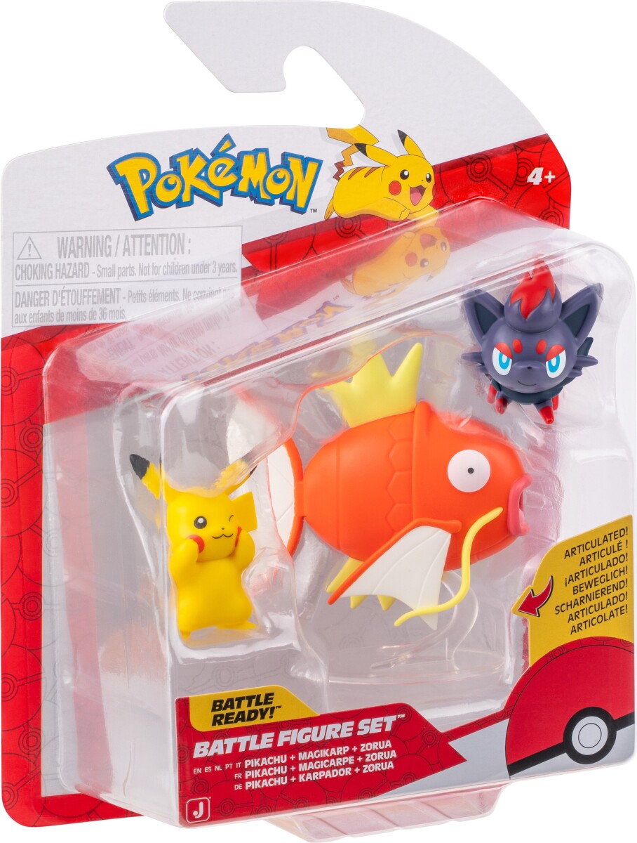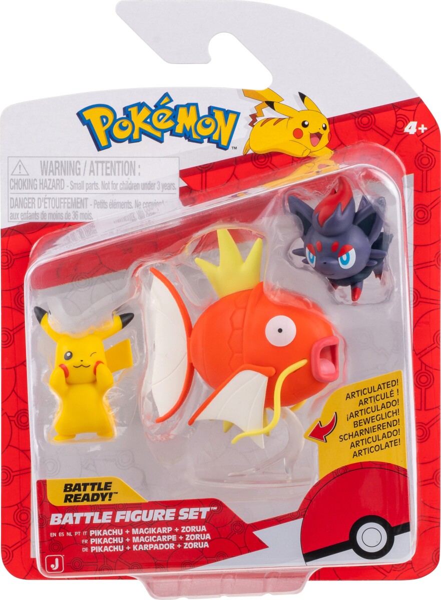 Pokémon Battle Figure Set indeholder tre detaljerede figurer af populære Pokémon: Pikachu, Magikarp og Zorua. Hver figur er lavet i robust plast med levende farver og fine detaljer, der gør dem ideelle til både leg og samling.