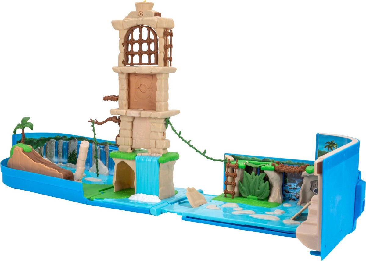 Tag kampen op i et univers fyldt med bevægelse og overraskelser: jag modstanderen under et brusende vandfald, opdag det skjulte tempel med sin hemmelige elevator, og kæmp dig op gennem fire niveauer af actionfyldte platforme. Afslut duellen ved at åbne porten og tænde flammen på toppen – og fortsæt derefter kampen helt ned til kysten, hvor to kampkastere står klar til næste runde.