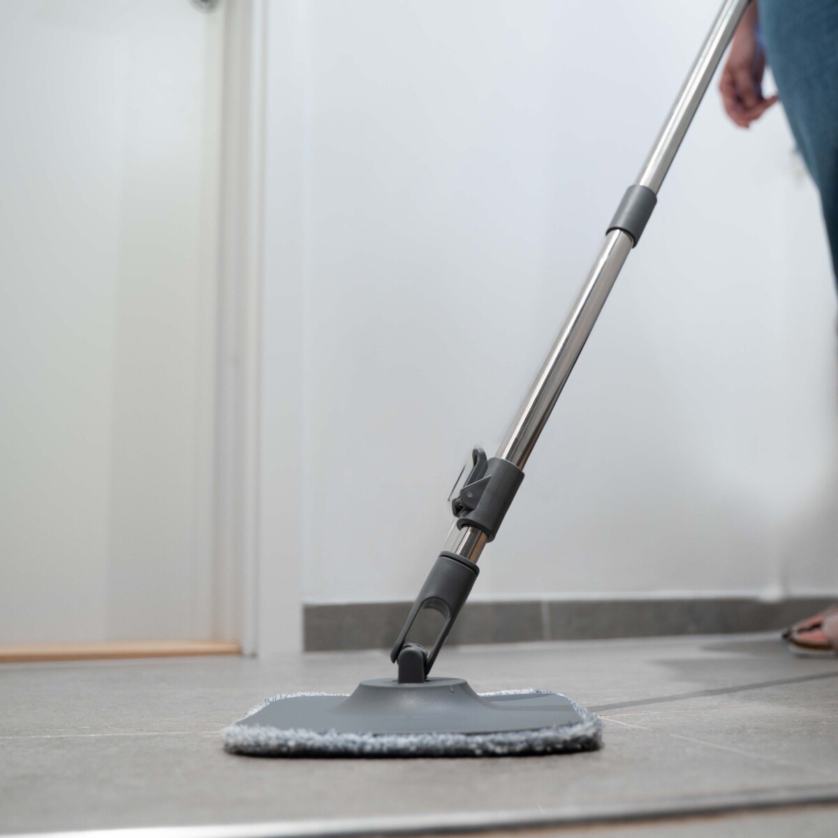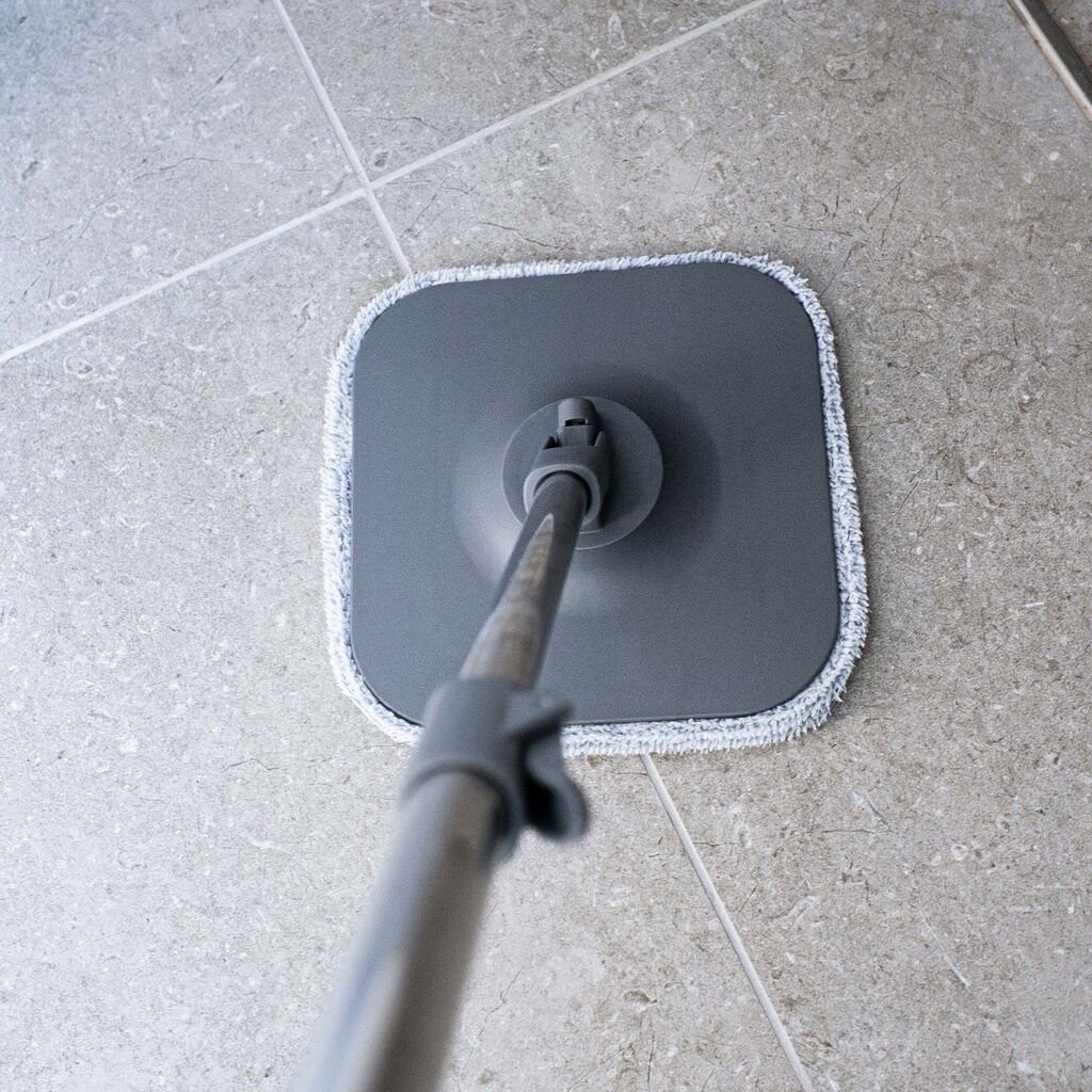 Moppehovedet har et kvadratisk design, som adskiller sig fra traditionelle aflange hoveder, og gør det nemt at nå hjørner og kanter. Det teleskopiske skaft kan justeres mellem 110–130 cm og drejer 360° ved hovedet, hvilket skåner ryg, arme og håndled under rengøringen.