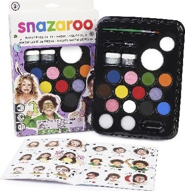Dette ansigtsmaling-sæt fra Snazaroo indeholder 20 farver af høj kvalitet, der er skånsomme mod huden og lette at fjerne med vand og sæbe. Produkterne er vandbaserede og fri for parfume, hvilket gør dem velegnede til følsom hud.
